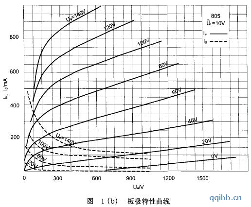 乙类功率管和甲类功率管是有很大区别的,甲类功率三极管一般栅负压较深,最大板流时栅压为零,在整个放大区内不产生栅流,理论上输入阻抗为无穷大。板极内阻较小,电路对扬声器有较大的阻尼系数。栅极对板极电压放大系数很小,是所谓低μ管。如2A3、300B、211、845等。而乙类功率三极管,栅负偏压较浅,甚至为正栅偏压,在整个放大区内,栅压在正栅压与负栅压之间交替变化,并且在正栅压范围中有相当幅度的摆动,产生栅流。该栅流随板压变化而变化,与栅压不成正比,呈非线性状态。板极内阻普遍较大,功放对扬声器的阻尼系数很小,一般为零点几。栅极对板极有很大的电压放大系数,μ常有60~200,是所谓高μ管。如805、806、809、810、8l1A、812A、833、838、572B等。其中838的各项参数与805相同,唯一不同的是板极由管脚引出,没有屏帽,都是乙类推挽功放用管。据说曙光厂也生产无屏帽的805,型号为FU-5A,即为838的全等管。805管约有11kΩ板内阻,μ值约为60。805管脚接线如图1(a)所示,板极特性曲线如图1(b)所示。板极最高工作电压1500V,最大板极损耗125W。