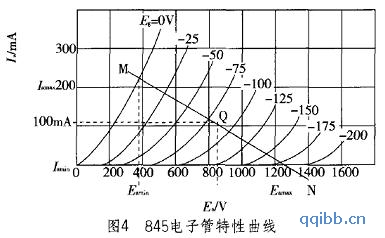 根据845电子管的静态特性曲线(如图4), 基本参数和已知的电源电压780V,输出变压器初级端的交流阻抗5.5 kΩ。确定Q点为甲类状态Ia=100mA,Ea=780V,并根据输出变压器初级的交流阻抗5.5 kΩ。使Eamax=1150V,Iamax=200mA,(Ra=1150V/0.2=5750 Ω≈ 5.5 kΩ),经过Q点做一斜线MN,即为845的动特性曲线。根据这条斜线,可看出与其相应的栅偏压为Eg=-90 v(此线路已有不少文章说明,这里不在赘述)。