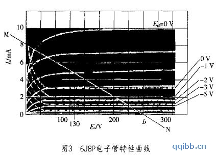 采用国产管6J8P(属于中高频电压放大五级管),该管以音乐味浓郁而著称,曾被世界多种名机采用。为充分利用该电子管的放大特性, 根据电子管手册中给出的6J8P的静特性曲线(如图3),为使Eg2= 100V, 特意在Eg2上使用51 kΩ 和33 kΩ 的分压电阻。根据串联电阻的电压公式V2=V×R2/(R1+R2),33 kΩ 分压电阻上的电压V2=250×33 kΩ/(51 kΩ+33 kΩ)=98 V。再经过电容滤波(C4,220 uF/220 V), 电压可稳定在100V左右(有名气的胆机则会去掉C3,R1, 采用WY3P进行直接稳压效果更好)。根据6J8P的静特性曲线, 设电源电压为250 V, 阳流为8mA, 负载电阻则为Ra=V/I=250 V/0.008 A ≈30 kΩ 。以(250V,8mA)为原点画一直线MN,即为该管的动特性曲线,确定其上a,b两点的中心点Q, 那么相对应的栅极电压为 Eg=-2.5 V。可以看出,6J8P采用标准接法的最佳静态工作点Q 为Ea=130V,Ia=4mA,Eg=-2.5 V, 保证了“Q”点处在甲类放大状态下,从而在理论上先进行Hi-Fi放大。同时,作为前级电压放大, 只要输入音频信号电压在0.5~1.5 V(现代音源设备,输出信号电压多为1 V左右),输出交流信号电压就可达约100V,经6п3C做阴极输出,在提高推动电流的同时,又能降低输出阻抗。