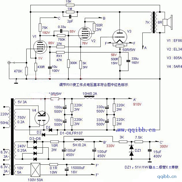 这是一款经过实做,性能尚可的805单端电路,且调试十分简单。推动级虽然没有加入负电压供电,但是抬高了805阴极电位,等效增加了推动范围。整体施加了少量环路反馈,不会造成音质受损的问题。需要注意保持805灯丝供电电压 在10V ±0.2V以内。输出功率在25W以上。