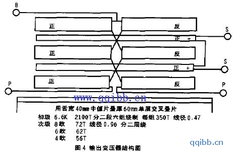 输出变压器是一部胆机制作成败的关键,本机采用优质铁芯和无氧铜线自行绕制。绕制方法比较复杂。初级与次级相互隔开,初级分为三层六组,一边正绕.一边反绕。次级以同样的方法绕制夹在初级各层之中。圈与圈之间留有间隙,不能密绕,可以得良好的高频响应。注意各绕组的抽头不要搞混。绕完后插入铁芯,在次级接上6v左右的交流电,然后连接初级的各绕组抽头,注意每连接一组测得的电压应增高,如果降低就是连接反相了,应调换过来, 直到叠加电压最高为准(同相连接)。只要精心仔细,按图操作,成功率极高;比某些徒有虚名的成品输出牛好得多。铁芯尺寸取大些,中低频好,但漏磁,漏感、分布电容都大, 高频频响下降。铁芯取小些,中高频不错,但中低频差些, 声音薄。关于铁芯的材质业界也有争论,现在市场上的成品输出变压器基本都采用了高值有取向芯片,体积小,铜耗低,可以减小分布电容、电感,能够得到良好的高频响应。而采用经典的中值硅钢片,在相同参数下,声音更温暖丰厚,胆味更浓郁。笔者经过无数次实验, 取4×6中值硅钢片钱芯按图精心绕制,取得了良好频响,听感上也极靓声(在本机的实际制作时.采用了两只275W电子菅广播机的输出变压器的铁芯改造绕制)。