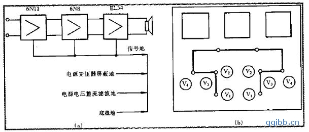 (3)“一点接地”设置在末级功放接地点上,它包括信号地、屏蔽地、电源整流、滤波地、底盘地四种地,汇接到“一点接地”上 灯丝地需经试验设置在前置级接地点上。