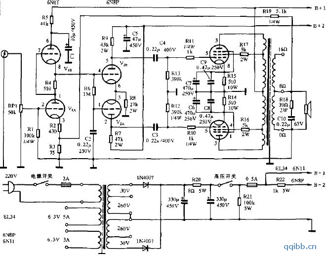 电源由电源变压器屏极高压、栅负偏压、灯丝电压组成。该机电源变压器采用250W、C型铁芯。初级0-240V-220V两组;次级260V+30V两组,经1N4007电源整流二极管全波整流后,可提供B+直流高压380V,EL34灯丝电压6.3V、5A两组,6N11、6N8灯丝电压6.3V 3A一组。