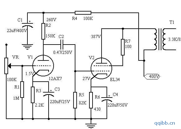 EL34电子管在音响发烧友中的知名度很高,在《高保真音响》2000年4月刊登的“最常见100种电子管排名”中,EL34高居榜首。国内外著名的电子管机生产厂家,有不少用EL34制作的电子管机名品。但是从功率输出级的电路形式来看,几乎都毫无例外的是推挽放大,原因是EL34的最大屏耗仅为25瓦,当采用单管单端放大时,如果按五极管或者超线性接法,最大不失真输出功率不超过12瓦,若是接成三极管,则只有6瓦左右。而采用推挽放大电路,就可以轻易的将输出功率做到三四十瓦,可见,在输出功率方面,推挽比单端大得多,但就音质和音色而言,单端机优于推挽机。笔者制作过的单端电子管机不少,有300B、2A3、EL34、FU15、FU50、FD422、FU7、6P3P、6N18P、6C33C等,也有好多发烧好友光临寒舍进行对比试听过,若要从音质价格比衡量,那么EL34无疑是最超值的,因为EL34的价格较低,差不多是300B的1/10,况且,此管不仅国内就有曙光、桂光、北京几种牌子,国外俄罗斯、捷克等国也在生产,选择余地很大。本文介绍的这台EL34单端功放,采用三极管接法,最大不失真输出功率有6瓦,介于2A3和300B的输出功率之间,用来推动雨后初晴LS 3/5A和用黑花岗岩制作的MOREL MW166+MDT32自摩箱,音色通透柔和,而且电路简单易制。