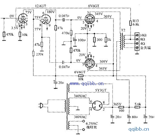 本机的电源部分也很简单,采用型RC滤波电路,因为推挽放大电路对电源纹波有较强的抑制作用,没有采用扼流圈式LC滤波,以减小整机重量和降低成本。图中5Y3G即国产的5Z2P,灯丝电压为5V,所需电流为2A。