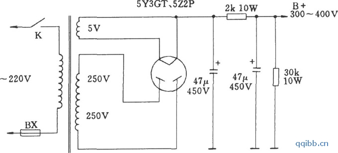 直热式整流电子管全波整流及滤波电路
