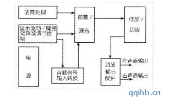 附图为常见杂牌AV功放机的电路构成框图,这种类型的功放机,以功放电路的故障率为最高,其次是电源、调节控制电路。其他电路出现故障的概率相对比较小。