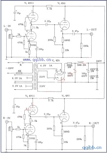 电子管前置放大电路由两个独立的放大器组成,左右声道的放大电路完全相同。其放大器的输入级采用SRPP电路(分流调整式推挽放大器),其频率响应从10Hz~40kKHz增益变化仅为±1dB,信号噪声比可达80dB。包括电源部分的电路图如下: