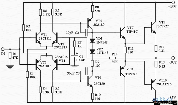 这是一个采用全互补对称电路驱动方式的OCL功放电路,它是目前中档功放用得较多的一种电路,具有对称性好,频响宽阔,结构简单等特点。其失真度虽不是特别低(0.03%左右) 但电路的转换速率、TIM失真等动态指标却相当好。因而音质很好,是目前制作家用高保真功放的首选电路。电路的第一级采用互补对称差分电路,每管的静态工作电 流约1mA,选用优质低噪声互补管2SC1815、2SA1015作互补差 分对管,有较低的噪声和较高的动态范围。第二级电压放大采用互补推挽电路,采用高互补对管A180、C180,工作电流约5mA,两管集电极串接的二极管和电阻为缓冲级提供约1.6V 的偏置电压。两只互补中功率对管TIP41C、TIP42C构成射随器缓冲驱动级,增设射随器缓冲驱动级是现代OCL电路的主要特点之一,它主电压放大级具有较高的负载阻抗,有稳定而较高的增益。同时 它又为输出级提供较低的输出内阻,可加快对输出管结电容Cbe 的充电速度改善电路的瞬态特性和频率特性。该级的工作电流也取得较大,一般为(10-20)mA,个别机型甚至高达100mA,与输出级的静态电流差不多,可使输出级得到充分驱动。其发射极电阻采用了悬浮接法(不接中点),可迫使该级处于完全的甲类工作状态,同时又为输出级提供了偏置电压。输出级为传统的互补OCL电路,采用了FT高达60MHz的三肯大功率互补对管C2922、A1216,静态电流约为100mA。输出端与输入级反相输入端接有环路负反馈网络,并将电路增益设定为31倍。