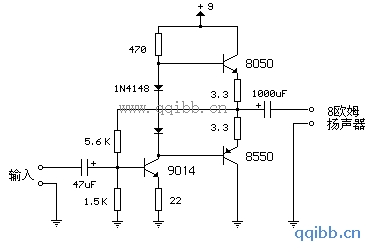电路如图所示,输入极(9014)的基极工作电压等于两输出极三极管的中点电压,一般为电源电压的一半,这个电压的稳定由输出三极管的基极的两个二极管控制。3.3欧姆电阻串联在输出三极管的发射极上,以稳定偏流。以减小环境温度、不同器件(如二极管、输出三极管)参数区别对电路的影响。当偏流增加时,输出三极管发射极与基极间电压会减小,以减小偏流。此电路输入阻抗为500欧姆,在使用8欧姆扬声器时,电压增益为5。