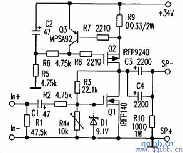 打造了一台既吸收电子管的“乐感”优势,又具有晶体管使用方便特点的晶体机,全机主角是Q1N-MOSFETIRFP140(见图),由于是接成单级的增益放大,故为反相输出,输出端是喇叭的负端,而接地点才是正端。另外有一颗P-MOSFETQ2 IRFP9240是配对的MOS-FET,但是别误会它们是在做推挽放大,在这里Q2只是Q1的前级负载,就像真空管以输出变压器作为屏极负载一般,只是MOSFET有更低的输出阻抗,不需要输出变压器做阻抗匹配,就可以直接驱动喇叭。Q2为电路提供2A的恒定电流,阻抗会随着Q1的on/off而变化故亦称为动态负载,它比固定式电阻负载有着更高的效率。由于本机以A类方式动作,要注意的是散热问题,虽然只有10W输出,静态消耗每声道却有70W,所产生的热量是惊人的。由于单组34V供电,所以以OTL方式输出,C3、C4之2200μF就是隔绝支流的输出电容。因为本机的输出电流被Q2所限制,在输出振幅不可能超过电源的情况下,本机的输出功率不会因为使用较低阻抗的喇叭增加功率。本机输出阻抗约1Ω,故阻尼系数约为8。该机除了增益低了点,前级音量必须大一些,加上整台机器都非常烫手之外,音色圆润通透和音场广阔是它的强项。