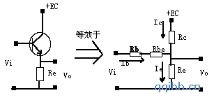 根据图A1的等效电路可知,发射极电流Ie=Ib+Ic又因为Ic=β*Ib(β是晶体管的直流放大系数)所以Ie=Ib+β*Ib=Ib(1+β),又根据电路回路电压定律:Vi=Ib(Rb+Rbe )+Ie*Re=Ib(Rb+Rbe)+Ib(1+β)Re(Rb是晶体管基极电阻,Rbe是基极与发射极之间的电阻,由于Rb和Rbe较少可忽略,那么Vi= Ib(1+β)Re,根据欧姆定律,电路的输入阻抗为Vi/Ib=Ib(1+β)Re/Ib=Re(1+β)。从此式可见电路的输入阻抗是Re的1+β倍,电路的输出阻抗等于Rc与Re的并联总阻抗.经上述分析得出结论:晶体管射随电路具有较高的输入阻抗和较低的输出阻抗。