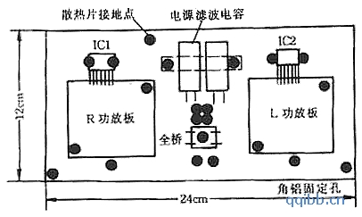 选5mm厚平整铝板一块(铜板更好),尺寸不小于12cmX24cm。按图5-57所示在铝板上钻孔,孔径4mm,用于安装电路板、电源滤波电容等。开孔根据印制板固定孔位置和具体制作情况决定。图中是将左、右声道线路板、滤波电容、全桥等安装在铝板上的参考示意位置。其中线路板及有关元件要注意与散热板的绝缘问题。滤波电容至线路板的正、负电源引线采用单股导线,便于弯折定型。有些连线需穿过铝板从背后引出。全桥采用方型带中心固定孔的方式。滤波电容量至少用10000uF/35V,功放IC与铝板间应加一层薄薄云母片绝缘。云母片两面涂上导热硅脂,此部分安装如图5-58所示。最后将整块铝板接地。