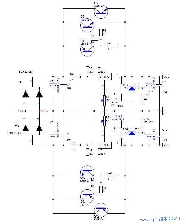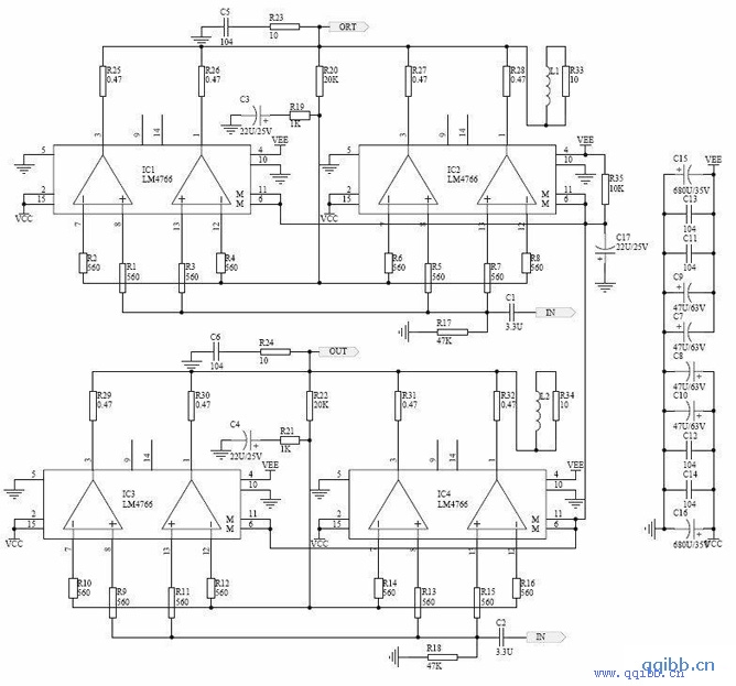 本电路由两片LM4766并联输出,功率和效果都比较令人满意,线路图如下: