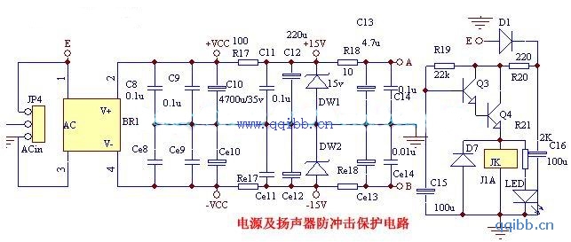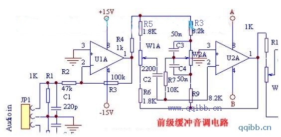 以上均只画出一个声道,另一声道原理相同。 JP1为音频输入端,在这里省去耦合电容,因为考虑到现在的音源CD ,VCD ,DVD,TURN,电脑声卡等,基本上输出级都有隔直电容,U2 和前面的阻容元件组成反馈式音调电路,,U1为前级线性放大部分,设为2倍的放大倍数。可根据实际情况来改变它的增益大小,R18、C13、C14为电源隔离滤波部分,以减少两级的相互串绕,DW1,DW2为稳压管,如果电源变压器为双12V ,则可以省去它。