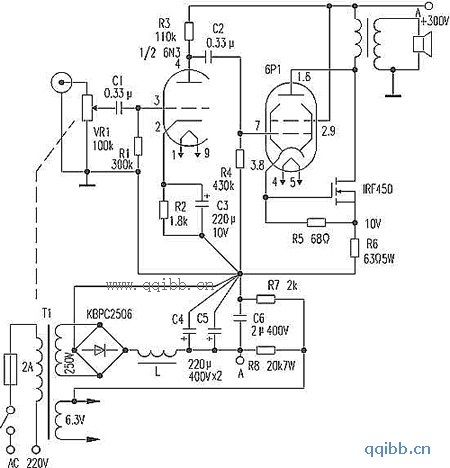 这是一款输出功率18W的甲类功放,末级采用电流串联负反馈电路(输出级自给偏压电阻两端旁路电容被取消),电气性能优越。电路如图。电子管三只,6N3与6P1都是花生管,场管IRF450的市面折机品价位也十分低廉。