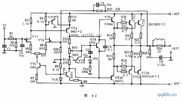 如图4-2所示,这部功放的输入级是一对场效应管,优点是输入阻抗高,动态范围大和噪声低。VT3、VT4组成第二级放大,VT5提供1.8mA的电流给VT1、VT2;VT6提供9.5mA的恒定电流给VT3、VT4。由于VD1的导通,电流电压即使有波动,不会影响到VT5、VT6的基准电压,保证了VT1、VT2两管电流的稳定。VT9~VT14组成互补输出级,它的输出电流受VT8的控制。VT8是一个恒压电路,动态内阻小,Vce8的电压恒定不变,调节RP2可以调整静态工作电流大小。VT7、C3、R13、VD2组成一个动态偏压电路,它的原理是:在信号输入增大时,VT7使VT8的基极电流下降,VT8的Vce升高,VT9~VT14的电流也相应升高,最高峰值可达4~5A,使推挽输出自动工作在甲类状态,不仅减少交越失真和谐波失真,而且提高电源的利用率,动态偏压的控制量由Rl3决定。C5是加速高频信号的大环路负反馈电容,具有相位超前的补偿作用。可降低瞬态失真和互调失真,并可防自激。输入级还加有高频滤波网络,以便将一些不必要的高频噪音滤掉,提高信噪比。 VT9、VT10、用TIP41和TIP42代替 。VT11、VT12、VT13、VT14、可以用TIP35C和TIP36C代替。工作电压不要超过+50V和-50V,可以获得80W输出。