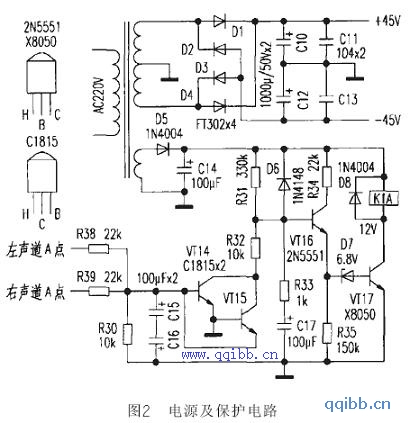 图2是功率放大器的电源及保护电路。保护电路具有开机延时及功率输出级中点直流过压保护的功能。刚开机时,右声道A点12V的保护电路供电电压经R31、R33向C17充电,此时VT16基极电压低,处于截止状态,并导致D7、VT17截止,继电器K1在开机瞬间不吸合,避开浪涌电流对扬声器的冲击。随着时间的推移,C17充电到一定程度VT16饱和导通,导致VT17也饱和导通,继电器K1吸合,完成开机延时过程。