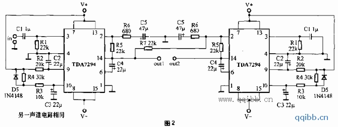 OCL电路图见图1,本电路是用两片TDA7294组成的双声道70W 功放。外围元件少,电路简单,当电源电压为土35V时,在8欧负载上可获得70W的连续输出功率。非常适合30平方米以下的环境放音。整流电路见图4,如音箱阻抗小于8欧,电源电压应相应降低。