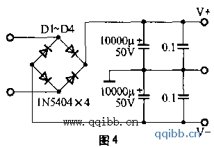 恒流功放电路见图3,整流电路见图4。本功放电路与前面两种结构有些不同,其反馈电路为电流取样、电压求和负反馈。这种电路结构就是人们常说的恒流功放,电路的具体分析不作详述,只介绍与传统恒压功放相比后较突出的优点。
