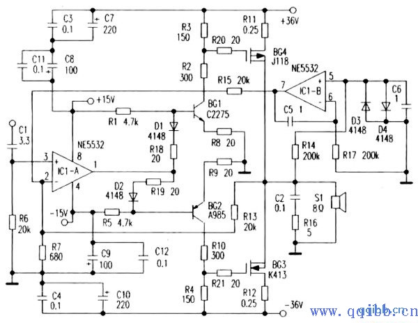 电路原理如下图所示,为典型的OCL功放。其中使用IC1-B为直流零点伺服。本电路使用两组电源供电,稳压+-15V供给运放NE5532,+-36V供给后级使用。