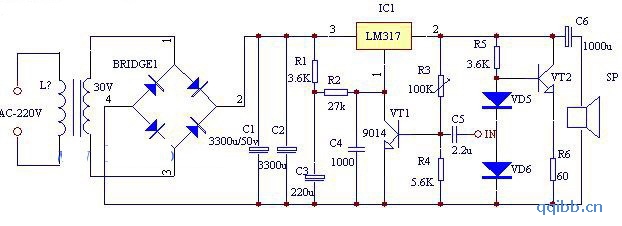 三端稳压IC选取LM317,三极管VT1选取9014。VT2选用8050型,二极管VD5、VD6选用2CP20,变压器的功率应大于50W。