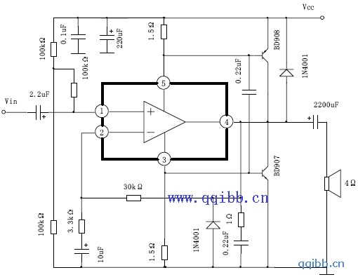 TDA2030AT是美国国家半导体公司九十年代初推出的一款音频功放电集成电路,采用TO-220封装,外围元件少,但是性能优异,具有频率响应宽和速度快等特点,从九十年代初一直到现在还被广大音响爱好者推荐。最可贵的是其价格已从当初的十几元降至现在的八九元,最适合于不想花太多的钱又想过过发烧隐的爱好者业余制作。该IC最的优点是在小功率输出时的音质能直逼中高档音响的听音效果,在标准工作电压下能获得30W的平均功率,这在一般家用情况下已经足够,笔者曾用NE5532前级音调电路推动该集成功放,正如各类电子报刊评价那样获得极佳的效果,遗憾的是这样性格高的集成电路却很少见于市售的功放和多媒体有源音箱中,虽然其外表是如何的赏心悦目和精致漂亮,但是打开外壳,却很难发现它的芳影,而是生产厂家为了节省那几元钱的成本,大都采用诸如2030或其它名不见经传的廉价电路,由于和TDA2030的封装完全一样,可以直接的代替它,可以获得立竿见影的效果,但是必须是正品。以下是应用电原理图,只画出一个声道,以下均只画出一个声道,另一声道原理相同。