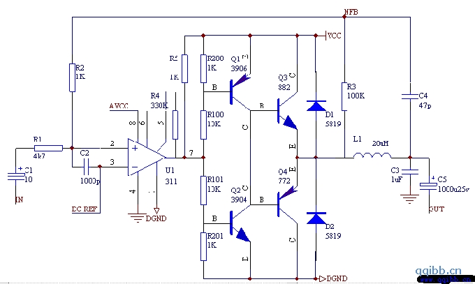 整机结构:先用LM311加上正反馈电阻和功率缓冲驱动级构成一个大功率的滞回比较器,然后加上RC积分负反馈回路,就能产生脉宽和频率受输入电压调制的自激振荡。为了消除输出滤波器的谐振改善频响特性,在LC滤波器的输出端和反相端之间接入一个小电容做超前补偿。