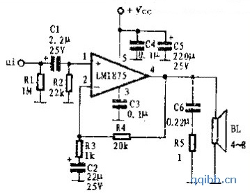 电路如图一所示。音频信号经∏型衰减网络R1、R2、C1对信号筛选后,送入功率放大集成电路LM1875的1脚进行功率放大后,由4脚输出推动扬声器BL。