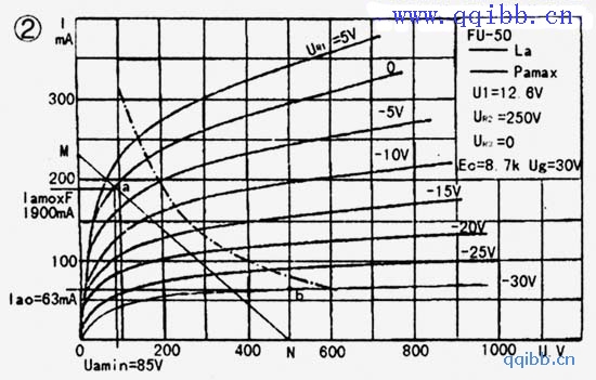 FU-50极限参数如下:Uamax=800V,Vg2max=50V,Ikmax=230mA,Pa-max=40W。取Ua=500V,用经验公式Ra=4 xUa/Ikmax=4x500V/230mA≈9kΩ,在特性曲线图(见图2)上取坐标Iamax=230mA,Ua=OV为M点,Ua=500V,Ia=0为N点,连接MN.此即为Ra=9kΩ时的动态负载线。MN线与Ug=0V的交点A, 该点电流为190mA,Uamin=85V。按AB1类放大器工作点电流为最大工作电流1/3~1/4选取原则,取Iao=1/3 Iamax=190/3=63mA。由Ia=63mA做X轴平行线与Ua=-30V曲线相交,交点即是该管工作点。此状态下,Ua=500V,Iao=63mA,Ug=-30V,Ug2=250V计算其输出功率Po=[(Uamax-Uamin)×Ia-max]÷2=[(500V-85V)×190mA]÷2=39.4W。