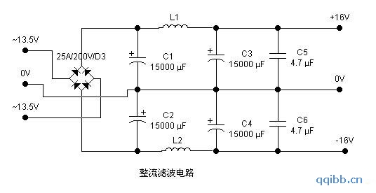 由于本机工作电流较大,实际工作单声道在3A以上,为了降低电源的内阻,整流元件采用了25A/200V以上的金属方桥,
