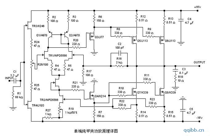 下面,就介绍一种工作稳定,调试简便的单端纯甲类功放电路,负载可以使用4-8欧姆,输出功率可以根据自己的需要设定在20W-50W。