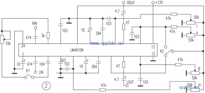 本功放制作在原功放(开关电源、优质功放板,电路见图1)的基础上,融入了集音调、音量、平衡及3D功能于一身的高品质音响电路LM4610N(电路见图2)及大幅度提高音乐清晰度的BBE电路XR1075,摒弃信号切换电路。LM4610N的电气参数如下:工作电压为9V~18V(典型值为12V);失真度0.03%;信噪比80dB;频率响应250kHz;音量调节75dB;平衡调节1~20dB;音调调节±15dB,最大增益为2dB,同时具有3D声场处理功能。以XR1071芯片为核心的音乐清晰度提升电路为美国EXAR公司的第二代产品,性能优于第一代M2150及日本罗姆公司的BA3884,其特性参数为:工作电压±5V,清晰度提升量0~9.7dB,低音提升量0~9.9dB,该电路各厂家成品板元器件选择稍有出入。