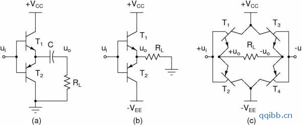 我们还是先介绍一些功放后级电路的基础。事实上,功放前级关心的是增益,后级关心的则是带负载能力。通常的扬声器阻抗都是8欧,若要产生10W的输出,后级的电流输出能力就必须大于1A。就这一点,集成运算放大器就不能胜任。所以必须加接电流放大级。这些电流放大级的电压增益甚至不到1,一般都是使用射级跟随器。功放后级的输出方式后变压器输出、OTL(Output TransformerLess,无输出变压器,下图(a))、OCL(Output CapacitorLess,无输出电容,下图(b))、BTL(Bridged TransformerLess,桥式,下图(c))等几种。变压器输出一般用于电子管后级很少用于晶体管电路,后三种在晶体管和集成电路后级中广泛采用。