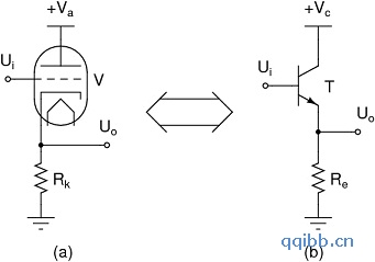 该电路事实上是一个SRPP电路和阴极输出器的级联,两者之间直接耦合。对于我们这一代人来说,晶体管电路已经先入为主,一下子可能还不能接受电子管电路。实际上,电子管电路实现的是和晶体管电路同样的功能。下图是实现同样功能的电子管共阴极放大器和晶体管共射极放大器。