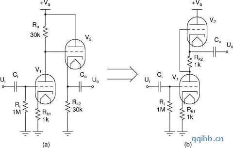 这个前级使用了一个SRPP(shunt regulated push-pull)电路。这个电路的特点是高频相应好。我们知道,晶体管共射放大器的上限频率由晶体管发射结分布电容和发射极负载电阻的乘积决定。当晶体管确定时,分布电容就定了,那么要提高上限频率,只能增大负载电阻。选用普通电阻自然不能增大太多,否则电路工作点就不对了。于是人们就用有源负载,比如用恒流源,交流电阻很大,整个电路增益高、频响好。现在集成电路都是这么做的。类似地,电子管电路也能这样变化。例如将共阴放大器和阴极跟随器的级联变成 SRPP 电路: