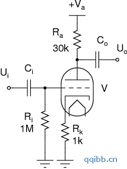 电路中 Rk 由于阴极电流,会产生几伏的压降。由于栅极通过电阻接地,栅极就自然产生了相对于阴极的负栅压。这种偏置方法还有自动稳定的作用。例如某外界原因导致阴极电流(就是屏极电流,栅极电流为零)变大,则栅压自动变负,阴极电流又自动变小。但是高档的电子管放大器是不这样偏置的,因为这样偏置不精确。通常使用电阻分压网络实现。当然没有了上述稳定性。