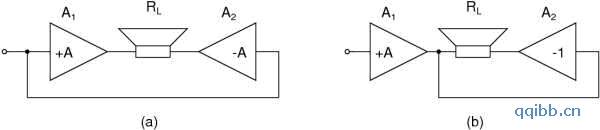 图(a)是比较直接的想法,两个增益互为相反数的功放推动一个负载。但是这样做有一个缺点,我们知道运放接成反相放大器(A2)时输入阻抗很低,这就会对电子管前级造成比较重的负载引起失真。如果前级是运放就没有问题。因而我们用(b)电路,A1在放大的同时起到缓冲的作用,另外用一个增益为-1的缓冲器产生一个反相输出信号驱动负载,达到同样的效果。[!--empirenews.page--]