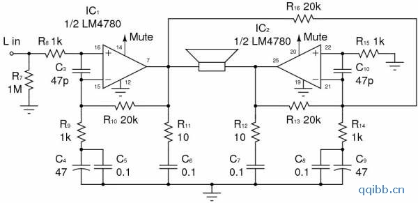 现在没有人会用分立元件组装BTL后级,因为与其消耗多一倍的元件搭建电路,不如把电源电压提高一倍来提高输出功率成本低廉。但是,集成电路工艺限制了集成功放芯片供电电压的提升。LM4780的极限工作电压为+-42V,已经是很高了,通常工作在+-35V,这时的输出功率在50W(8欧负载)。要想获得100W以上的输出功率,只有考虑BTL电路了。顺便说一句,现在的便携式设备如果有扬声器,也偏向于使用BTL,因为电池电压低,要提高功率,使用BTL是上策,因为在集成电路里多做一个放大器成本也增加不了多少。用集成放大器实现BTL的方法可以有以下两种。