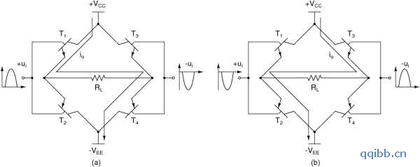 OTL电路采用单电源即可工作,所以在便携式功放中很常用,如果不加输出电容,则稳态时输出电压为0.5Vcc,所以输出电容不可省去。但是输出电容也影响了电路的低频响应。为了提高低频响应,OCL电路使用对称双电源供电,使稳态输出为0V,省去输出电容。这时,加在负载上的最大电压为Vcc。这样电源电压利用率偏低,因为整个电源电压为2Vcc。提高利用率的方式是使用BTL电路,负载接在电桥中,两端的最大电压可达2Vcc,相同供电电压下输出功率是OCL的四倍,但是元件数量翻倍。下图示出了BTL电路的原理。每次都是电桥对侧桥臂上的管子同时导通和截止。由于负载中点电压始终在0V,我们可以把BTL电路看成是两个等效负载为0.5RL的OCL电路。