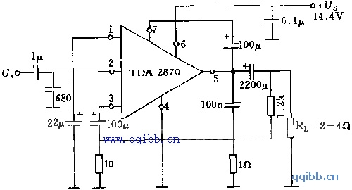 该电路特别适用于汽车收音机电路中,内部有热过负荷保护和短路保护措施。负载电阻2欧,输出功率达10W,供电电压范围为5~18V。