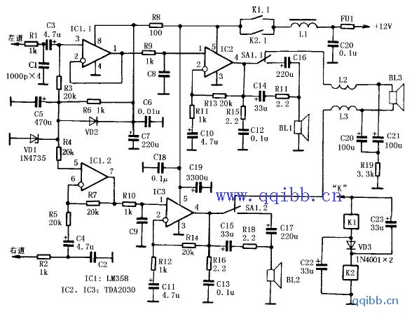 音频功率放大器电路如图一所示,双运放大器IC1 LM358构成前置放大器,它的一半在左声道工作于反相状态,而另一半在右声道工作于同相状态,前置放大器的放大倍数等于1,除了使信号在其中一声道反相外,它还提供功率放大器IC2 和IC3 集成电路TDA2030输入端的偏压。为了使功放放大器输出端在电源电压接通后直流电压平稳缓慢增大,消除接通电源瞬间产生的“喀啦”声,在电路中引入了消“喀啦”声电路R6、C5,电源接通时,C5 上的电压是缓慢增长的,不会使输出产生“喀啦”声。二极管VD2 用于电源断开后电容C5 快速放电,稳压管VD1 用于功率放大器输出端的直流电压,因而供电回路的波动不会影响声频放音的质量。该电路的另一特点可以工作在普通单通道状态,例如收听语言节目,在这种情况下降低了消耗功率,提高了被放大信号的下限频率。同时用开关SA1 断开扬声器BL3 及滤波器,而扬声器BL1、BL2 经过电容器C16、C17 连接,减弱了低于 100Hz~150Hz 频率的信号。BL1、BL2 扬声器也经过R17、C14 和R18、C15 连接,使高于 300Hz 频率的信号通过。