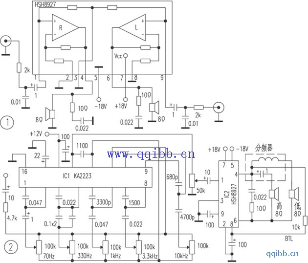 该IC是单列9脚封装,其主要电参数:工作电压典型为±16V,极限为±20V,输出功率在VCC=±18V时,在4Ω负载上每声道为30W,BTL接法可达80W;总失真度为0.15%;立体声道分离度为65dB;静态电流为70mA;闭环电压增益31dB。引脚功能:①R声道同相输入端;②R反相输入端;③内部中点电位;④R声道输出;⑤电源负极;⑥L声道输出;⑦电源正极;⑧L反相输入端;⑨L同相输入端。图1是HSH8927双声道简易功放电路,采用双电源供电,适合驳接台式收录机,若接VCD音频信号,必须加设前置驱动放大电路。如果需要更大的输出功率,可选用图2的BTL电路,输出功率可达80W。IC1是一个集成化5频点均衡器,调节各电位器可在70Hz、330Hz、1kHz、3.3kHz、10kHz的频段进行音频的提升或衰减。