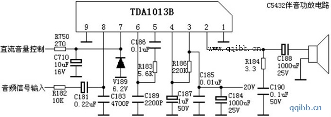 TDA1013引脚功能及参考电压:1脚:0V—地 2脚:7.7V—伴音输出 3脚:16V—电源 4脚:13.5V—电源5脚:0.3V—功放输入 6脚:6.7V—前置输出 7脚:2.8V—音量控制 8脚:1.9V—音频输入 9脚:0V—地。