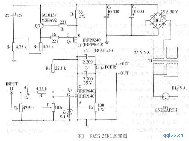 PASS ZEN 系列放大器具有结构简单,音质好等突出优点。PASS ZEN1放大器比PASS ZEN4,A5等放大器输出功率小得多.电路非常简洁,且静态功耗也小得多.由于PASS ZEN1采用电容作耦合输出,可避免直流输出对扬声器造成的损坏,所以制作时可省去扬声器保护电路;不必担心电容输出放大器的低频下潜问题,从实际测试和听音情况看,声音在20-20000Hz范围内比较平坦,同时由于采用VMOS放大管,音色酷似电子管放大器。
