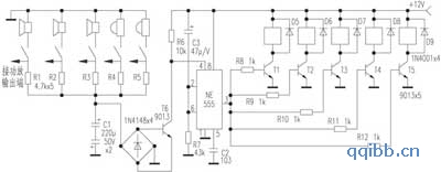 工作原理见上图,在接通电源的瞬间,由于C3上的电压不能突变,可视为短路,则NE555②、⑥脚呈高电平使IC复位,③脚输出为低电平,继电器不动作。当C3充电到②脚的1/3 VDD电平时(时间可自行设定),NE555被置位,③脚转呈高电平,使晶体管T1~T5截止,继电器释放,及时断开喇叭,达到保护目的。