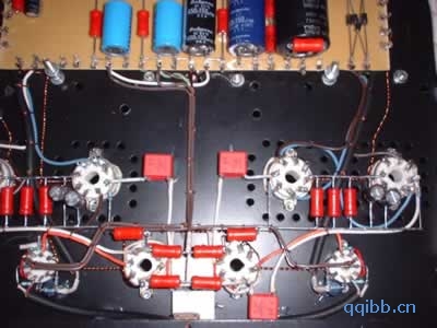 放大部分所有元件仍采用传统的搭棚焊接的形式,元件数量较少,容易连接,且可最大限度的降低干扰。这里应注意的是,该用导线连接的,信号连线应尽可能的短,还要远离灯丝线及高压线,或与灯丝线成垂直走线,且最好紧帖底盘走线。电压连线可以规规矩矩走线,以利整洁,应尽量远离信号线及灯丝线。耦合电容就近焊在管座附近,并紧帖地盘,最后用胶水粘牢,以仿松动。有些地方可以靠元件本身引线进行连接,如果元件的一端接地或接电源电压,那么就让这一端的引线长些,另一端尽量短些。还有小功率电阻尽量用小体积的,尤其是前级部分,体积越大,自身感应杂音信号的可能性就越大。这里我们使用的电阻有两种,一种是1/4W五环(精度1%)金属膜小电阻,另一种是早期的2W“大红炮”金属膜电阻。这种电阻过去的产量较大,很好用,噪音较低。由于其体积较大,也许只有我们这些胆机发烧友才能领略其优点(据香港朋友讲,这种“大红炮”在美国也很受欢迎,售价已近1美金/1颗!)。