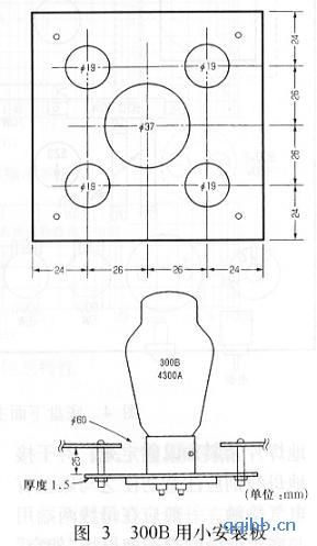 图2为底盘及其前、后部加工图,可采用2.0mm厚的铝板制作比较方便。当然,具体加工前应采购齐所有器件,再根据使用器件的实际尺寸进行适当修改加工尺寸。为了有利300B良好散热,特意为它加工了一块小的安装板,加工尺寸如图3所示,板厚为1.5mm铝板,300B及其安装方式已在图中表示得很清楚。