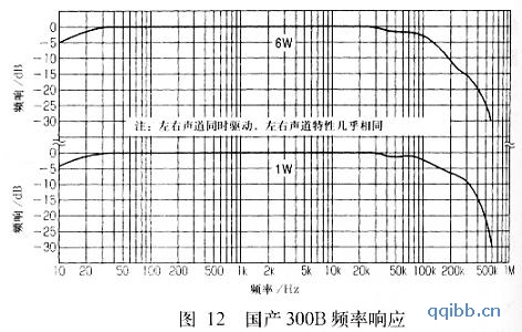 图12为国产300B的频率响应。它从30kHz开始起出现下降,而WE-300B则从50kHz起开始下降。不过,两者-3dB点均约为100kHz。