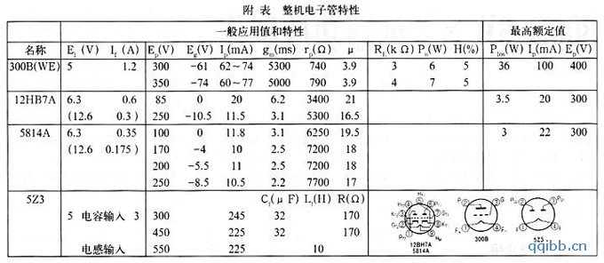 图1为本机电路图。除个别地方不同常规之外,可以说是十分传统的电路结构。整个电路相当简洁,尽量省去不必要的元件和电路,减少了器件数量。整机所用电子管的一般应用值和特性见附表。